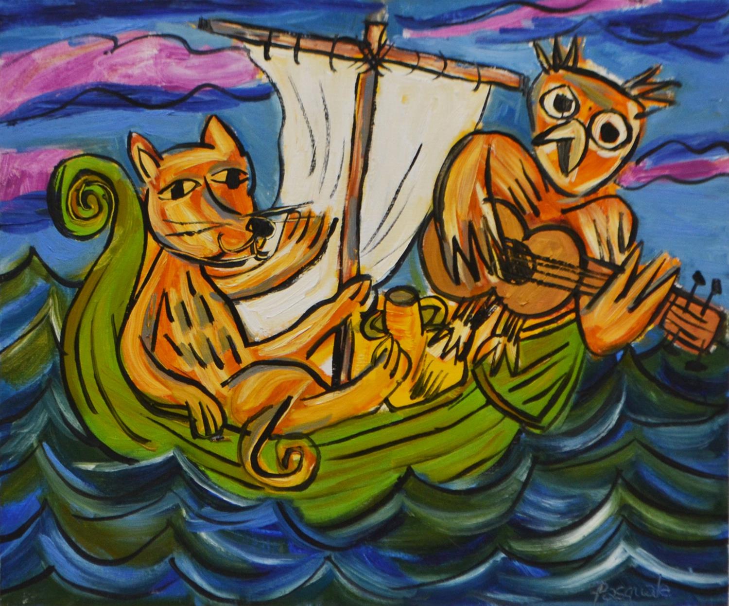 PASQUALE GIARDINO, UNTITLED (OWL AND PUSSYCAT), OIL ON CANVAS STRETCHED ON BOARD, 50 X 59CM