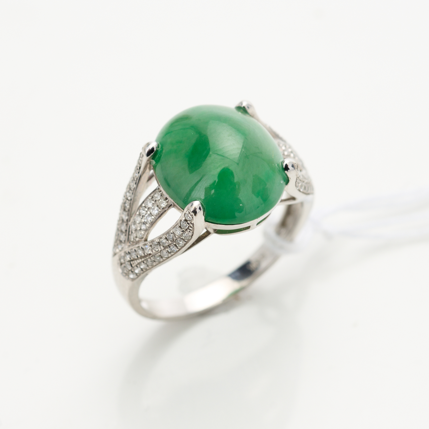 A JADEITE AND DIAMOND RING IN 18CT WHITE GOLD, RING SIZE O/P, 4.7GMS