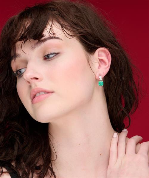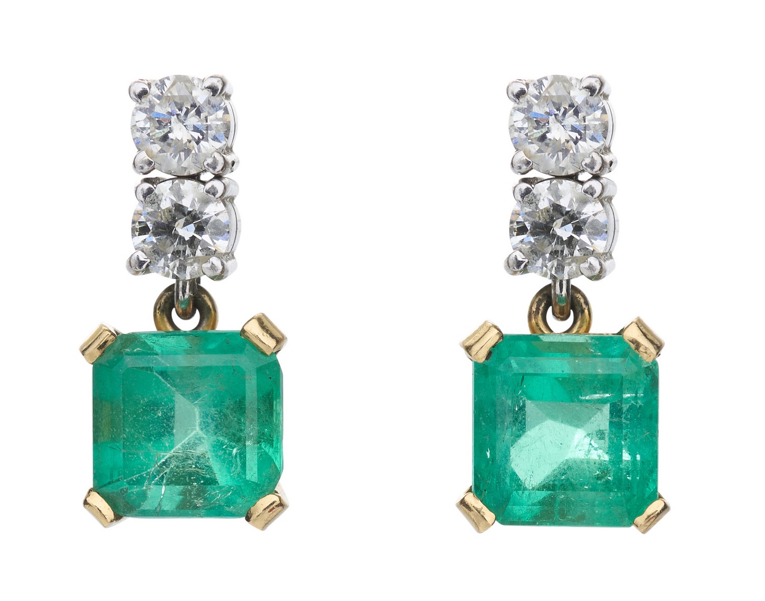 Each earring composed of a square emerald-cut emerald weighing approximately 2.60 carats, suspended below a double round brilliant-cut diamond surmount together weighing approximately 0.52 carats, to post and butterfly fittings, length 19mm.