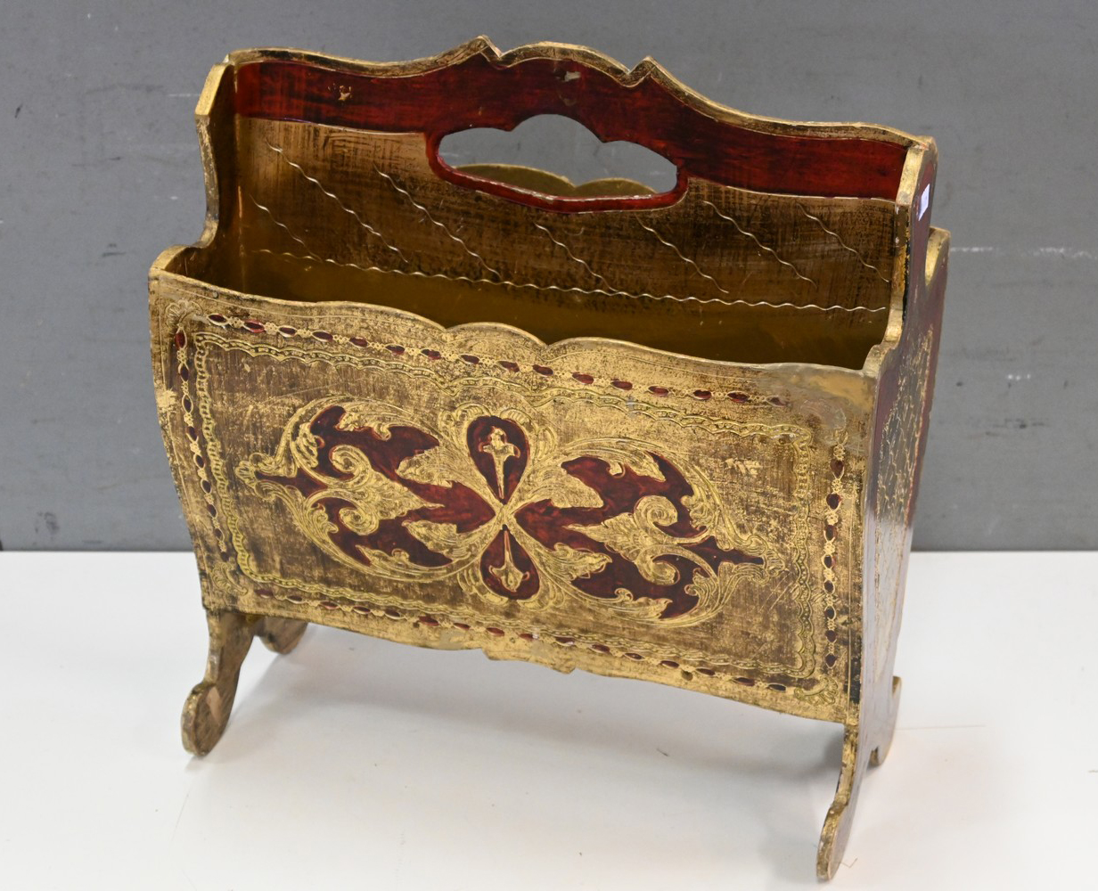 AN ITALIAN GILTWOOD FLORENTINE TWO SECTION MAGAZINE RACK WITH AUBURN DETAILING (41H x 38W x 20D CM) (LEONARD JOEL DELIVERY SIZE: MEDIUM)