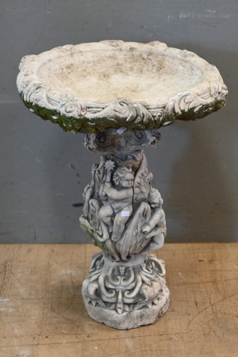 A FRENCH RECONSTITUTED STONE PUTTO AND CHERUB ADORNED 2 PIECE BIRD BATH (PLEASE NOTE THIS HEAVY ITEM MUST BE REMOVED BY CARRIERS AT THE CUSTOMER'S EXPENSE. LEONARD JOEL STAFF CANNOT ASSIST CARRYING THIS ITEM) (X-LARGE ITEM)