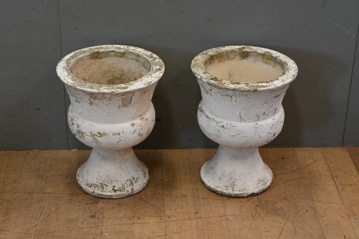 A PAIR OF FRENCH PAINTED WHITE RECONSTITUTED STONE GARDEN POTS (47H x 37D CM) (PLEASE NOTE THIS HEAVY ITEM MUST BE REMOVED BY CARRIERS AT THE CUSTOMER'S EXPENSE. LEONARD JOEL STAFF CANNOT ASSIST CARRYING THIS ITEM) (X-LARGE ITEM)