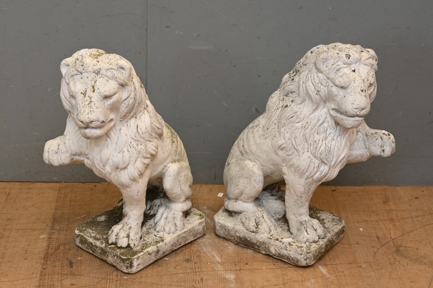 A PAIR OF FRENCH RECONSTITUTED STONE RAMPANT LIONS (A/F) (69H CM) (PLEASE NOTE THIS HEAVY ITEM MUST BE REMOVED BY CARRIERS AT THE CUSTOMER'S EXPENSE. LEONARD JOEL STAFF CANNOT ASSIST CARRYING THIS ITEM) (X-LARGE ITEM)