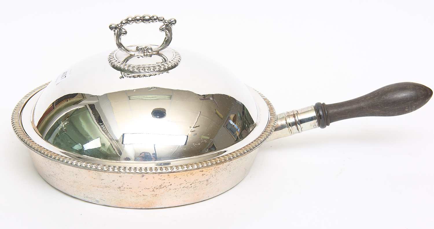 A WOODEN HANDLED ENGLISH SILVER PLATE LIDDED TUREEN WITH THREE SECTION REMOVABLE INTERNAL DIVIDE DIA.27CM, LEONARD JOEL LOCAL DELIVERY SIZE: SMALL
