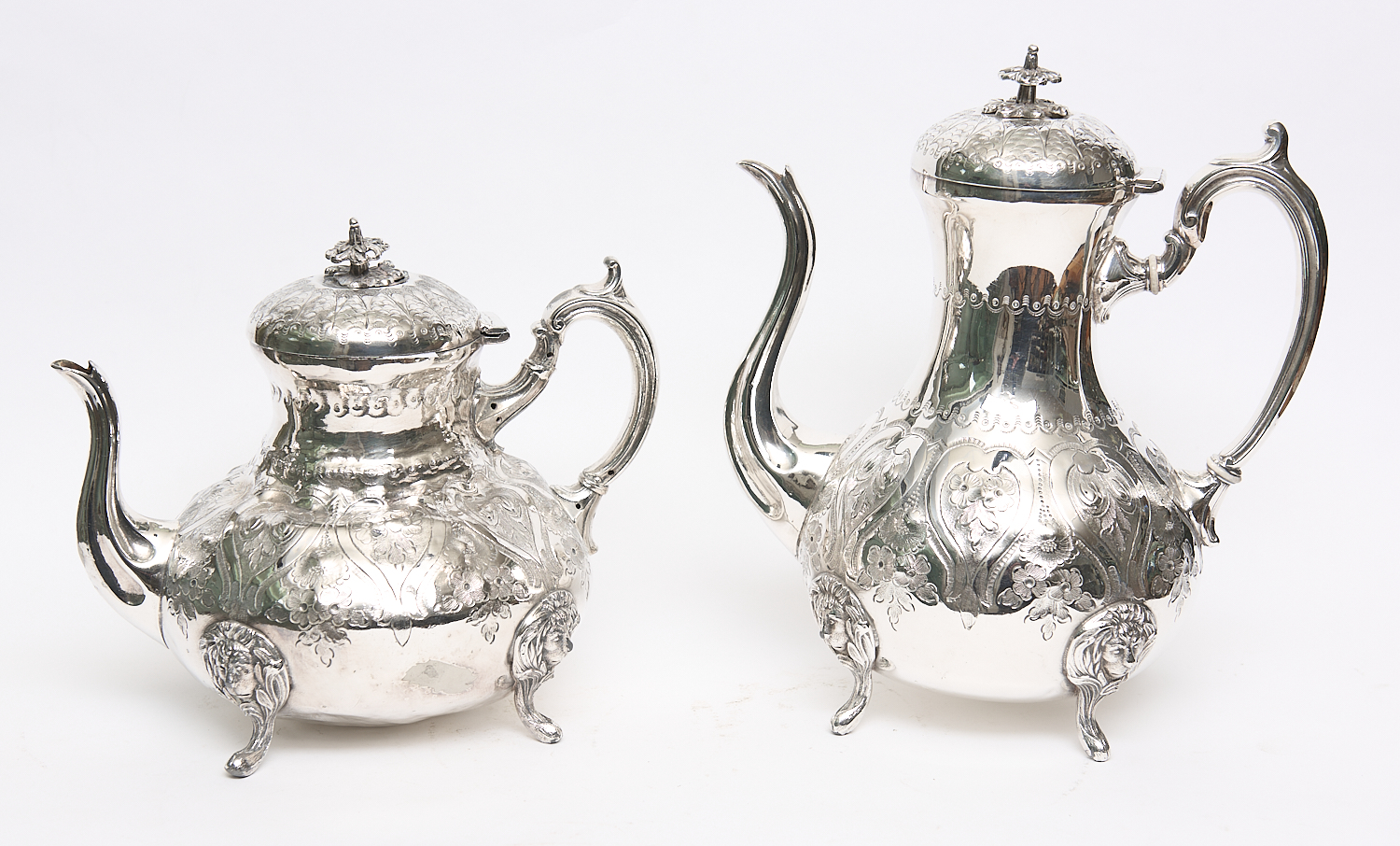 A VICTORIAN HEAVILY EMBOSSED SILVER PLATE TEAPOT AND COFFEE POT, LEONARD JOEL LOCAL DELIVERY SIZE: SMALL