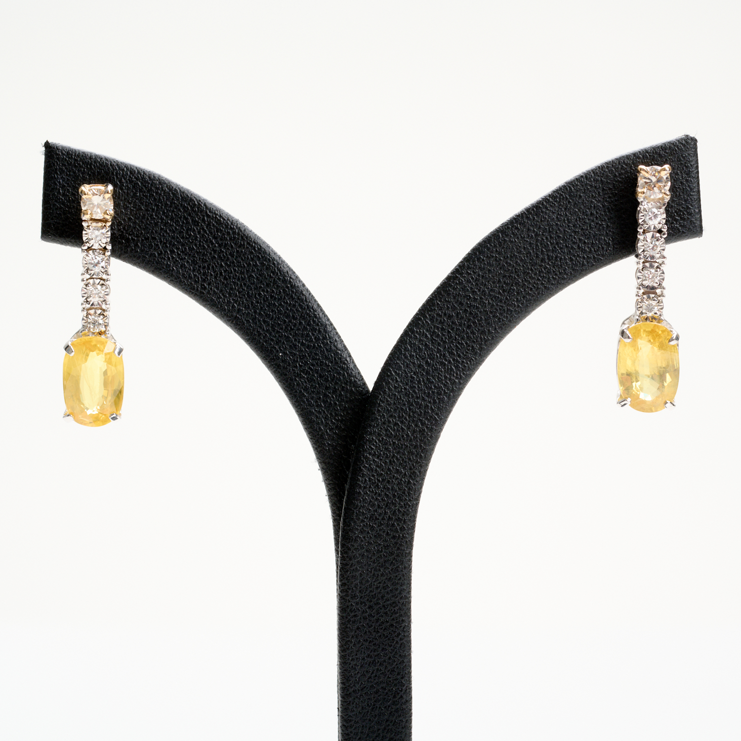 A PAIR OF YELLOW SAPPHIRE AND DIAMOND SET EARRINGS IN TWO TONE 18CT GOLD, THE SAPPHIRES TOTALLING 5.20CTS, THE DIAMONDS TOTALLING 0.35CTS, SIZE 6 X 26MM, WEIGHT 4.51GMS