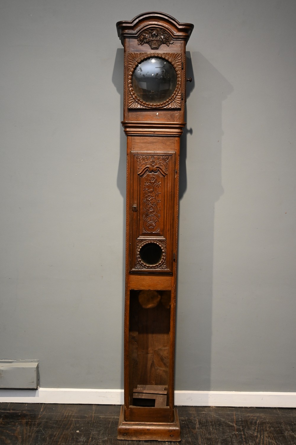 AN 18TH CENTURY FRENCH PROVINCIAL GRANDAFTHER CLOCK CASE (A/F) (235H x 40W x 30d CM) (PLEASE NOTE THIS HEAVY ITEM MUST BE REMOVED BY CARRIERS AT THE CUSTOMER'S EXPENSE. LEONARD JOEL STAFF CANNOT ASSIST CARRYING THIS ITEM) (X-LARGE ITEM)