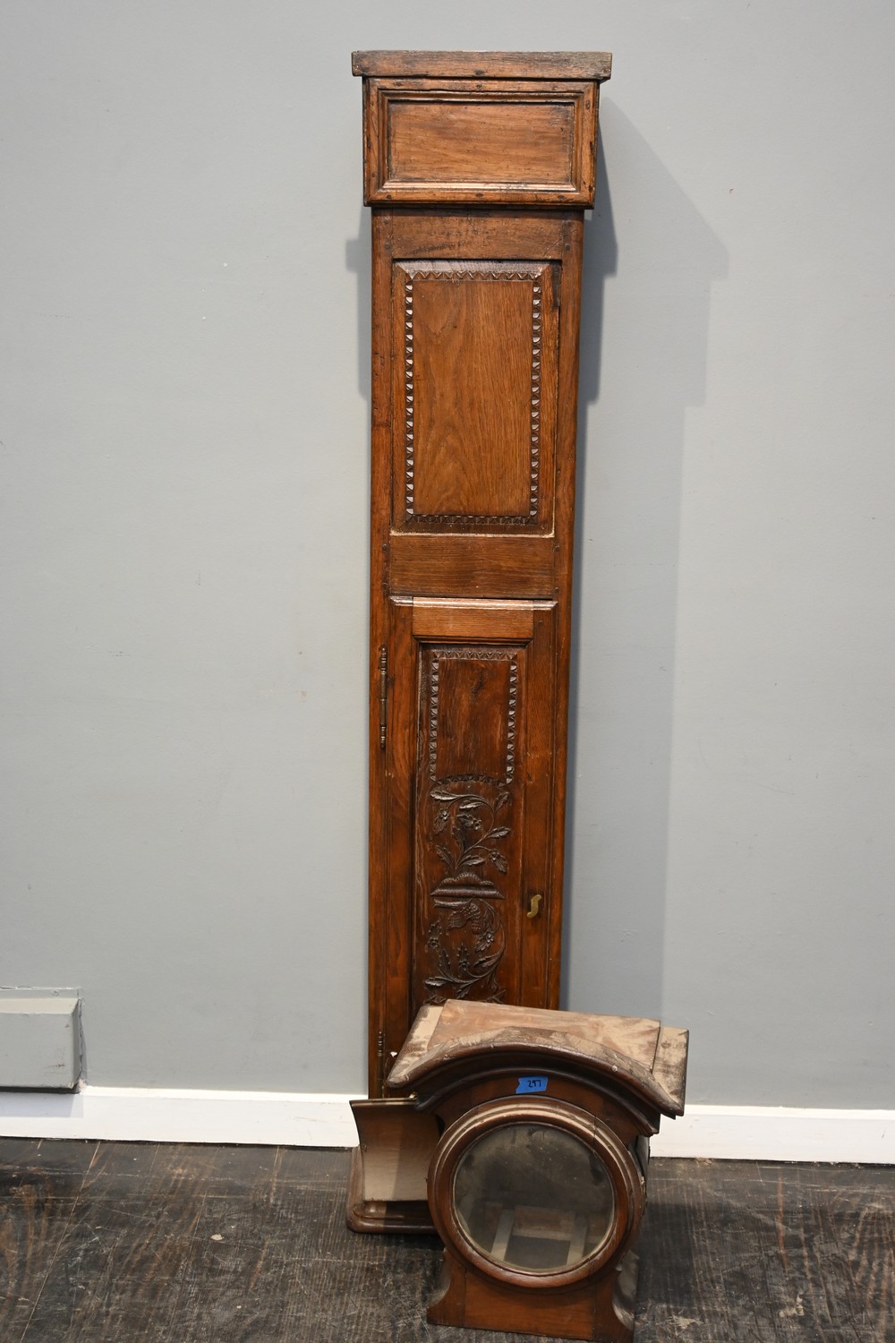 A 18TH CENTURY FRENCH PROVINCIAL GRANDAFTHER CLOCK CASE (A/F) (240H x 49W x 29D CM) (PLEASE NOTE THIS HEAVY ITEM MUST BE REMOVED BY CARRIERS AT THE CUSTOMER'S EXPENSE. LEONARD JOEL STAFF CANNOT ASSIST CARRYING THIS ITEM) (X-LARGE ITEM)
