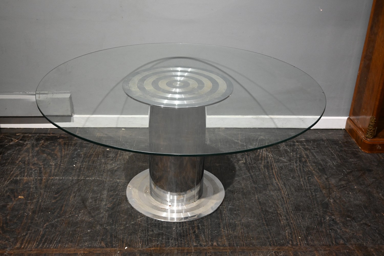 MID CENTURY ITALIAN CHROME PEDESTAL GLASS TOP CENTER TABLE, C.1970'S (A/F) (71H x 150D CM) (PLEASE NOTE THIS HEAVY ITEM MUST BE REMOVED BY CARRIERS AT THE CUSTOMER'S EXPENSE. LEONARD JOEL STAFF CANNOT ASSIST CARRYING THIS ITEM) (X-LARGE ITEM)