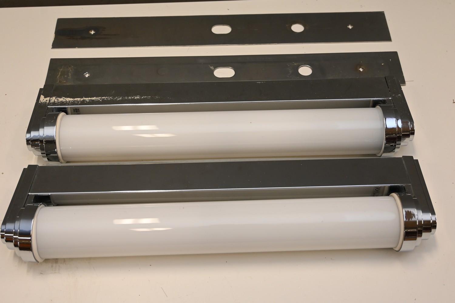 A PAIR OF FRENCH CHROMED ART DECO STYLE WALL SCONCES, EX HOTEL INTER CONTINENTAL PARIS (A/F) (54W CM) (LEONARD JOEL DELIVERY SIZE: LARGE)