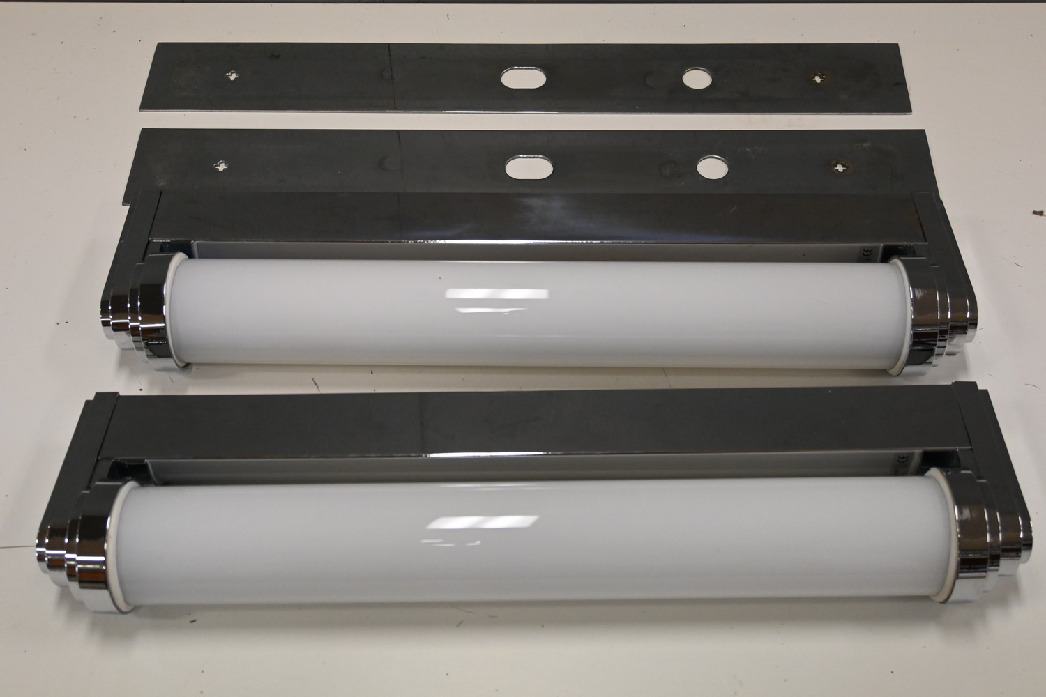 A PAIR OF FRENCH CHROMED ART DECO STYLE WALL SCONCES, EX HOTEL INTER CONTINENTAL PARIS (A/F) (54W CM) (LEONARD JOEL DELIVERY SIZE: LARGE)
