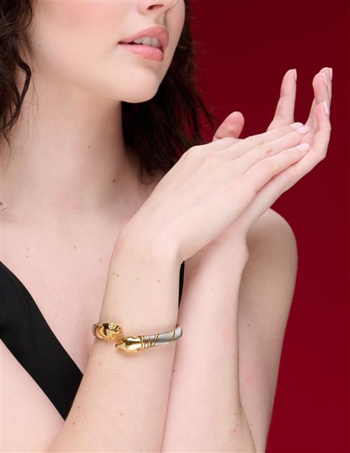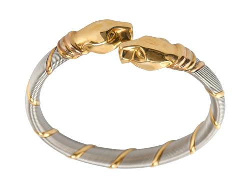 The flexible bangle, terminating in a double polished gold panther head, completed by a spiraling stainless steel bands detailed spaced by polished gold bands, inner diameter 62mm, signed Cartier and numbered 577300, accompanied by a Cartier pouch.