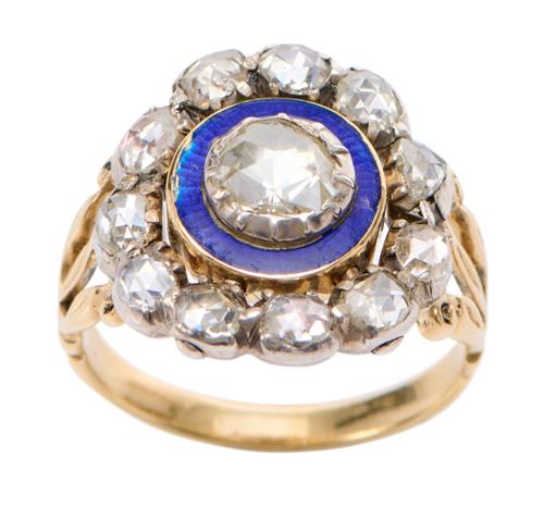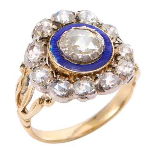 Of cluster design, centring a rose-diamond, within a blue enamel surround and ten further rose-cut diamonds, ring size M, accompanied by an antique box.