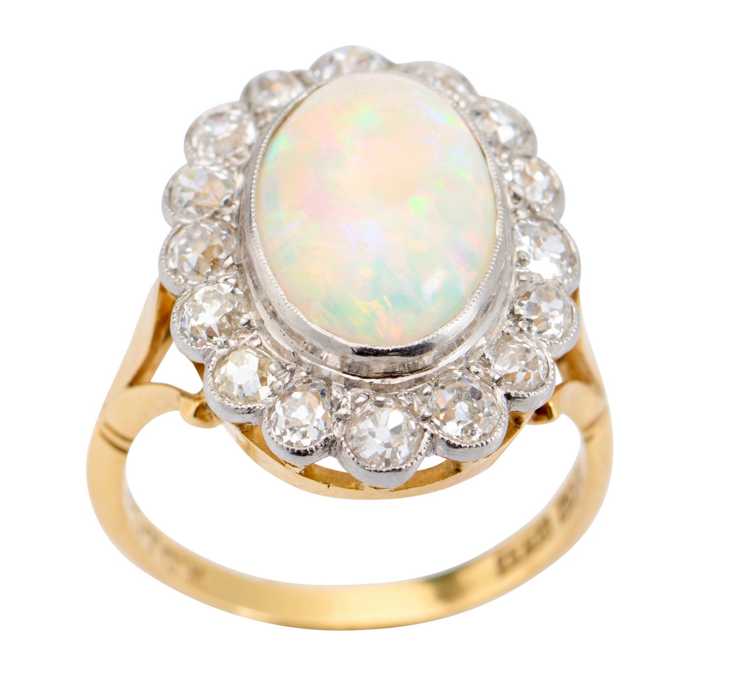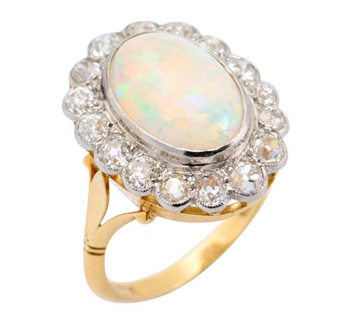 Of cluster design, centering an oval opal cut en cabochon weighing approximately 2.40 carats, within a surround of fifteen old European-cut diamonds together weighing approximately 0.75 carats, signed W.D. & Co., ring size O.