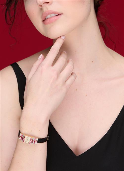 Case: 18ct pink polished gold retro case between concave shoulders pave with diamonds and accented with rows of calibre-cut rubies,