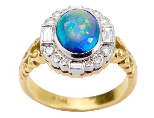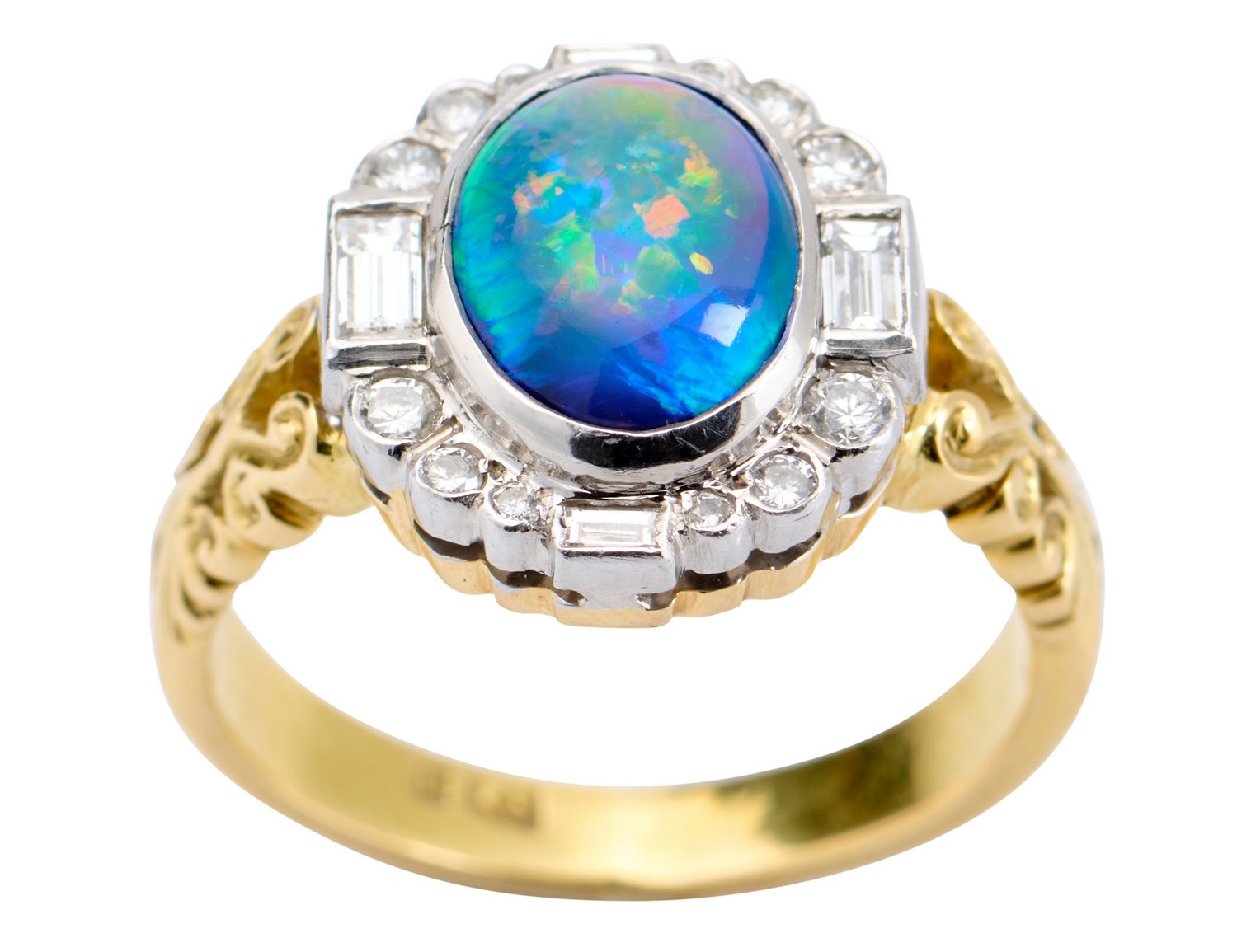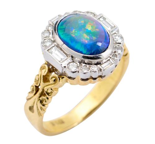 Centring an oval opal cut en cabochon weighing approximately 1.72 carats, within a surround of baguette and round brilliant cut diamonds, ring size O.