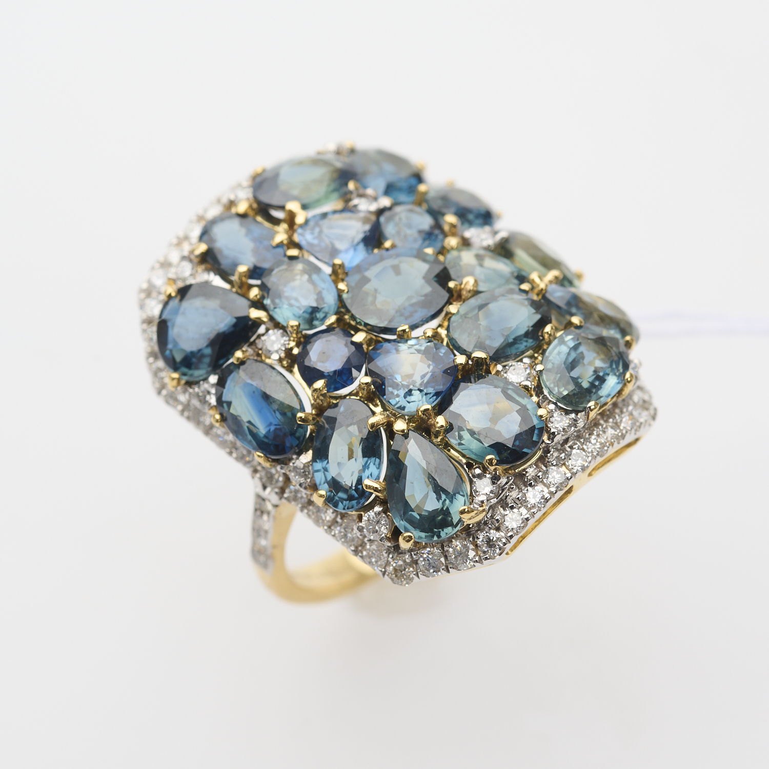 A PARTI SAPPHIRE AND DIAMOND DRESS RING IN TWO-TONE 18CT GOLD, SET WITH VARI-CUT SAPPHIRE TOTALLING 10.27CTS, WITHIN A BORDER OF ROUND BRILLIANT CUT DIAMONDS TOTALLING 0.77CTS, 8.06GMS