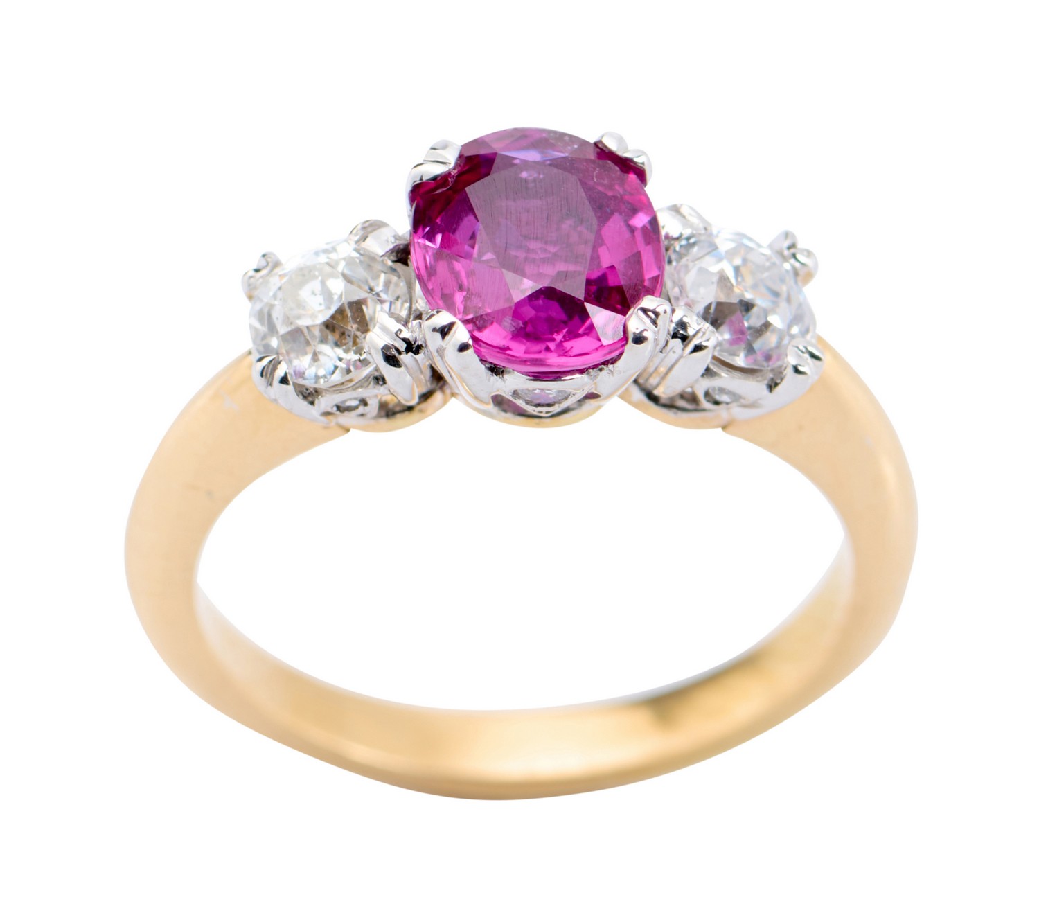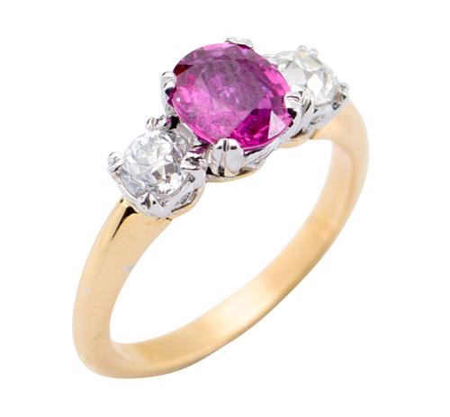 Centring a claw-set cushion-cut ruby weighing approximately 1.22cts, flanked by old European-cut diamonds together weighing approximately 0.58cts, ring size L.