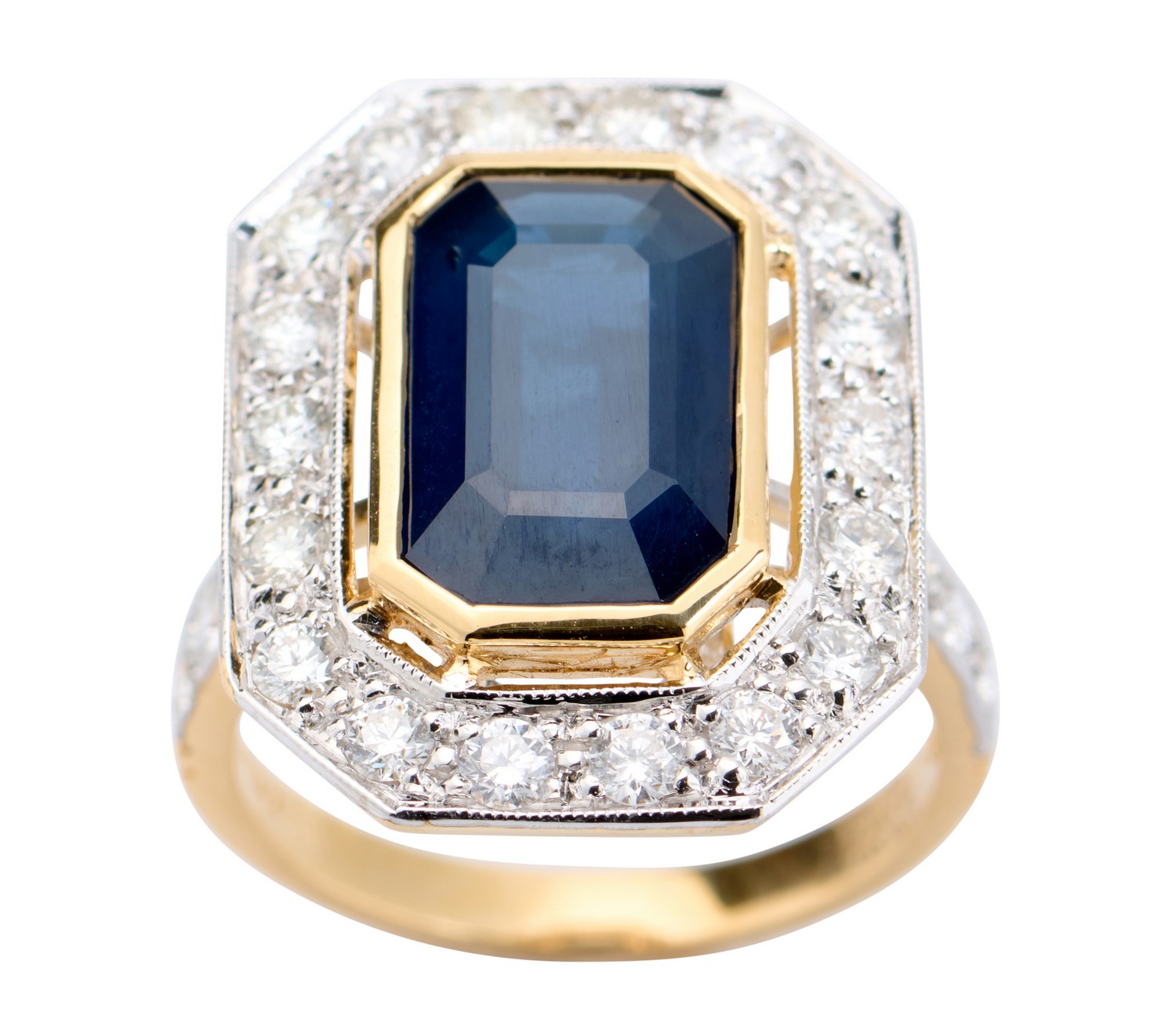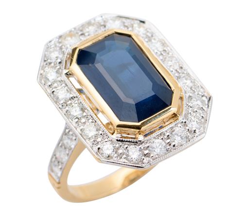 Of cluster design, centring an emerald-cut sapphire weighing 5.44 carats, within an octagonal surround of thirty-four round brilliant-cut diamonds together weighing 1.47 carats, ring size N.