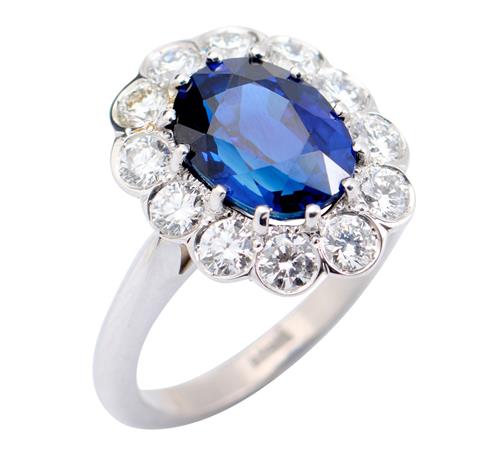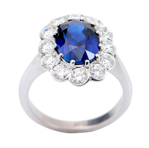 Of cluster design, centring an oval-cut sapphire weighing approximately 3.86 carats, within a surround of twelve round brilliant-cut diamonds together weighing approximately 1.02 carats, ring size M.