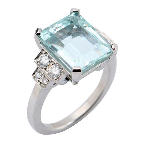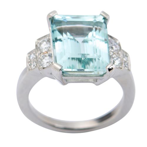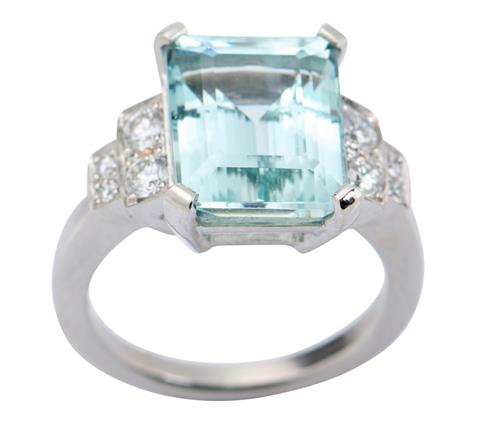 Centring an emerald-cut aquamarine weighing approximately 5.24 carats, to stepped shoulders set with round brilliant-cut diamonds together weighing approximately 0.31 carats, ring size K 1/2.