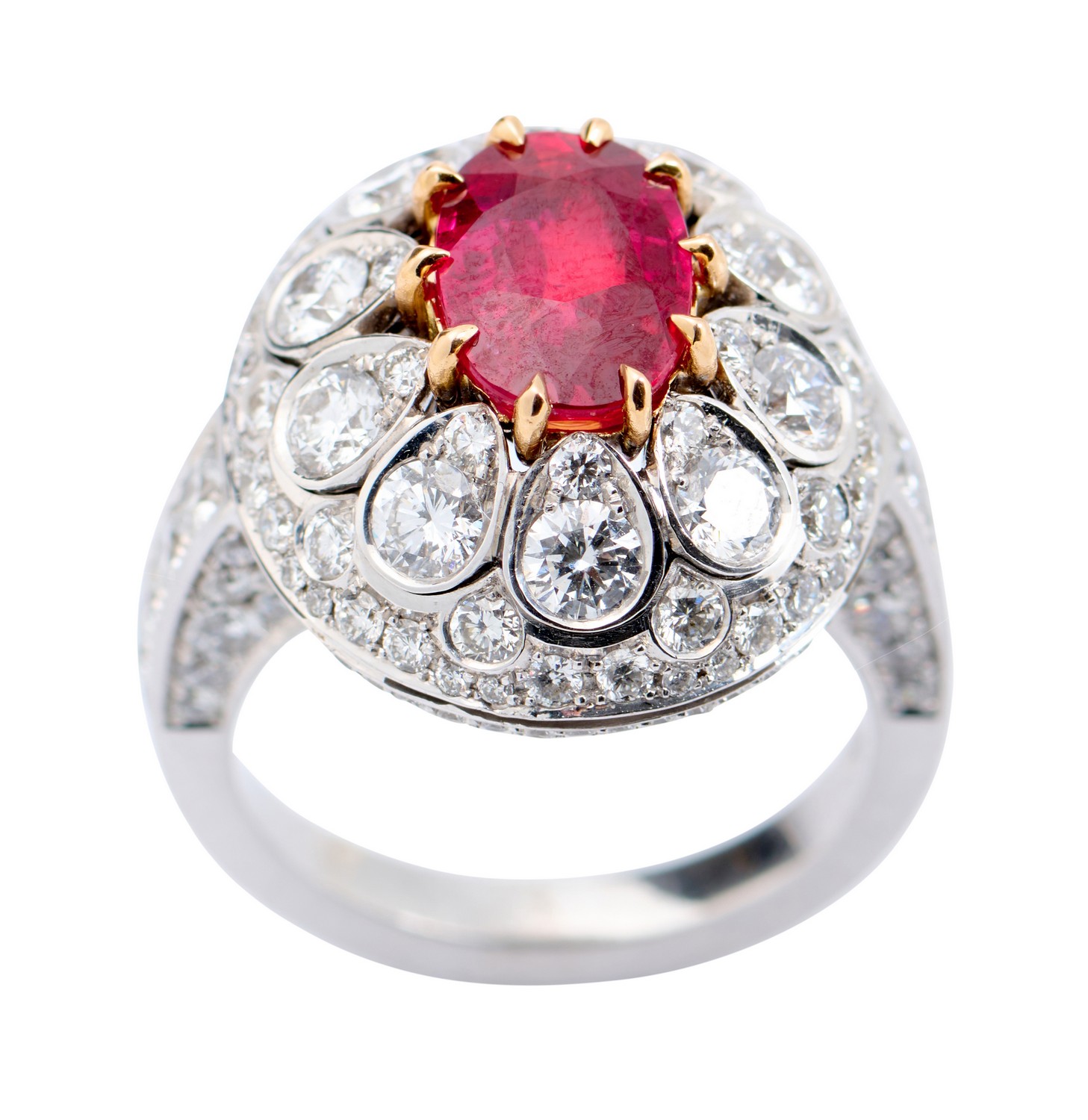 The domed plaque, centring a claw-set oval-cut ruby weighing 2.09 carats, within a surround of ten round brilliant-cut diamonds and pavé-set diamonds together weighing approximately 2.88 carats, ring size M.