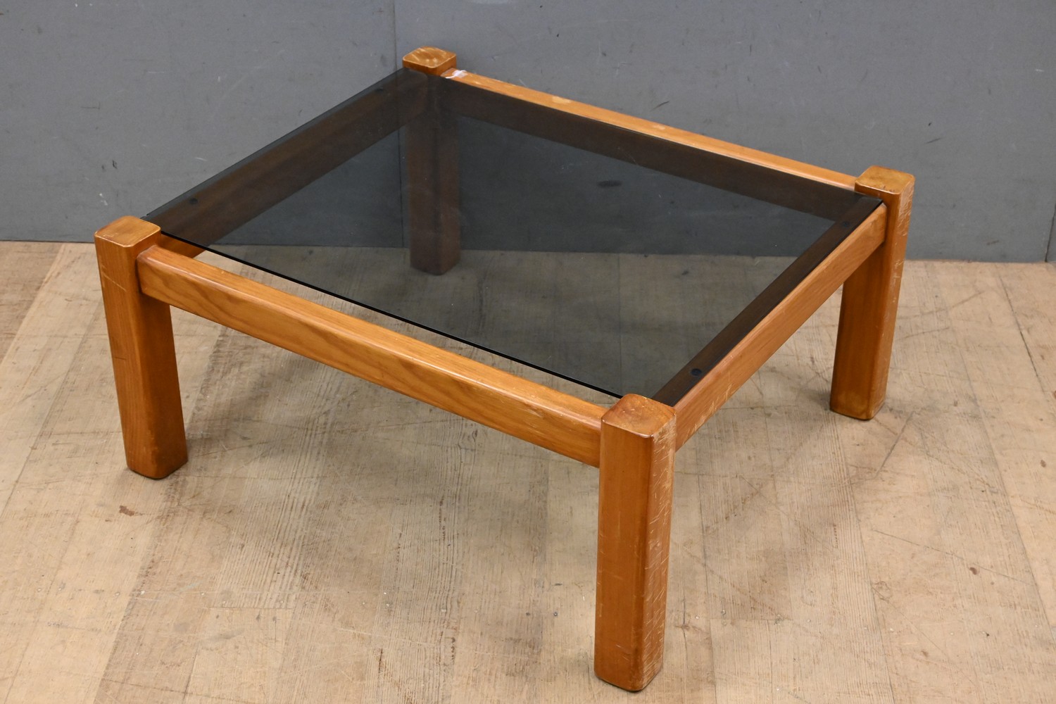 A MID-CENTURY TIMBER AND GLASS COFFEE TABLE (A/F) (H39 X W85 X D85 CM) (LEONARD JOEL DELIVERY SIZE: LARGE)
