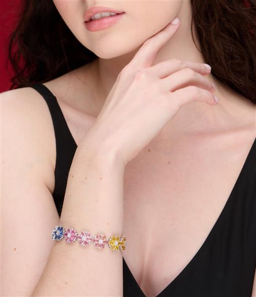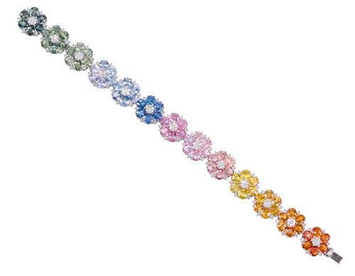 78 oval cut, mixed fancy green, blue, pink, yellow, orange coloured Sapphires (36.52ct TSW, eye clean clarity), claw set, with 169 round brilliant cut Diamonds (2.22ct TDW, H-J colour, SI1-I2 clarity),