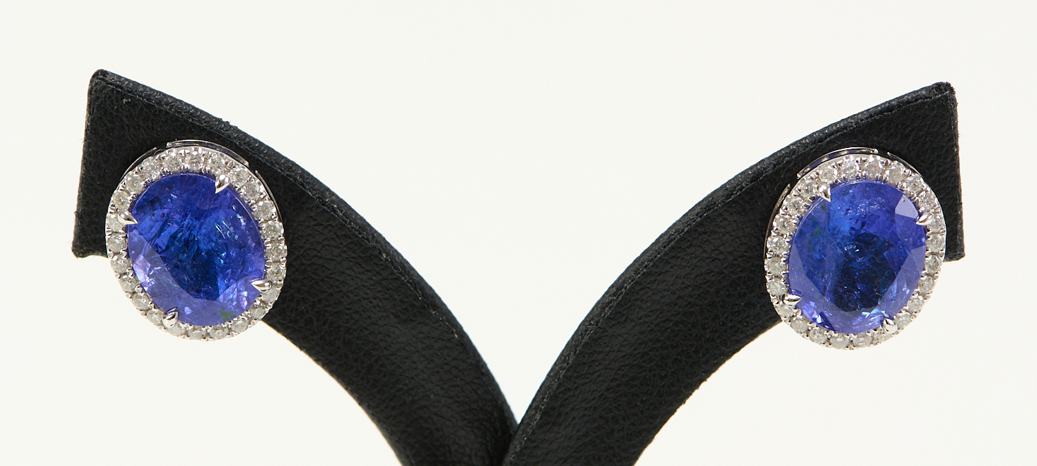 A PAIR OF TANZANITE AND DIAMOND EARRINGS IN 14CT WHITE GOLD, THE OVAL-CUT TANZANITES TOTALLING 6.76CTS, THE DIAMONDS TOTALLING 0.38CTS, TO POST AND BUTTERFLY FITTINGS
