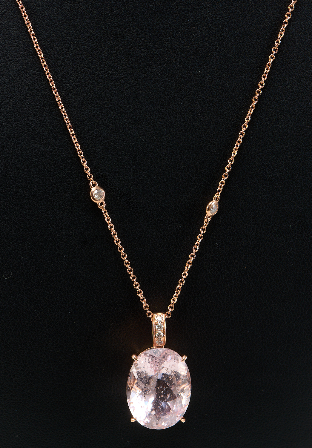 A KUNZITE AND DIAMOND PENDANT NECKLACE IN 14CT ROSE GOLD, THE OVAL-CUT KUNZITE WEIGHING 14.17CTS, TO A DIAMOND SET BALE AND CHAIN TOTALLING 0.30CTS, 500MM