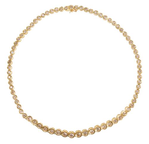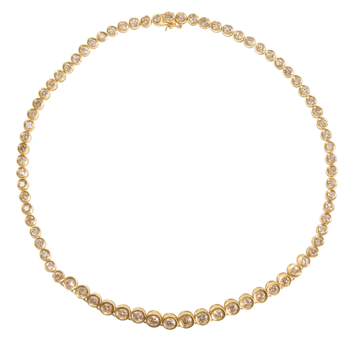 Designed as a line of seventy-five graduating collet-set round brilliant-cut light cognac diamonds together weighing approximately 15.30 carats, completed by a concealed box clasp, length 400mm.