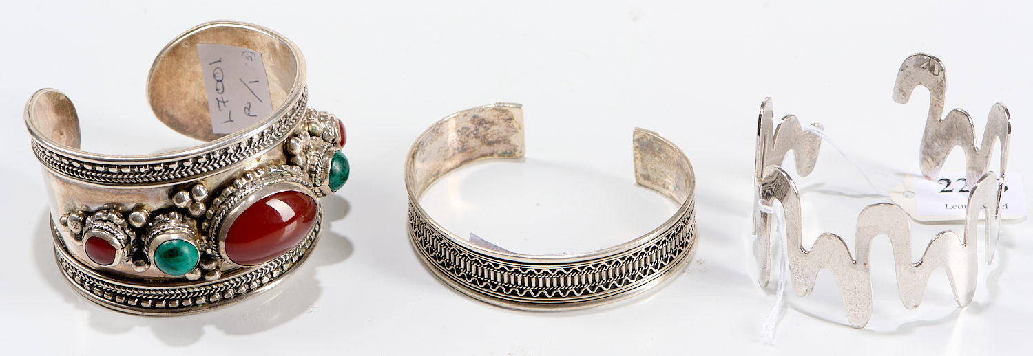 THREE VINTAGE SILVER CUFF BANGLES, ONE GEM-SET, TWO IN STERLING SILVER, THE THIRD (SQUIGGLE DESIGN) IN SILVER PLATE
