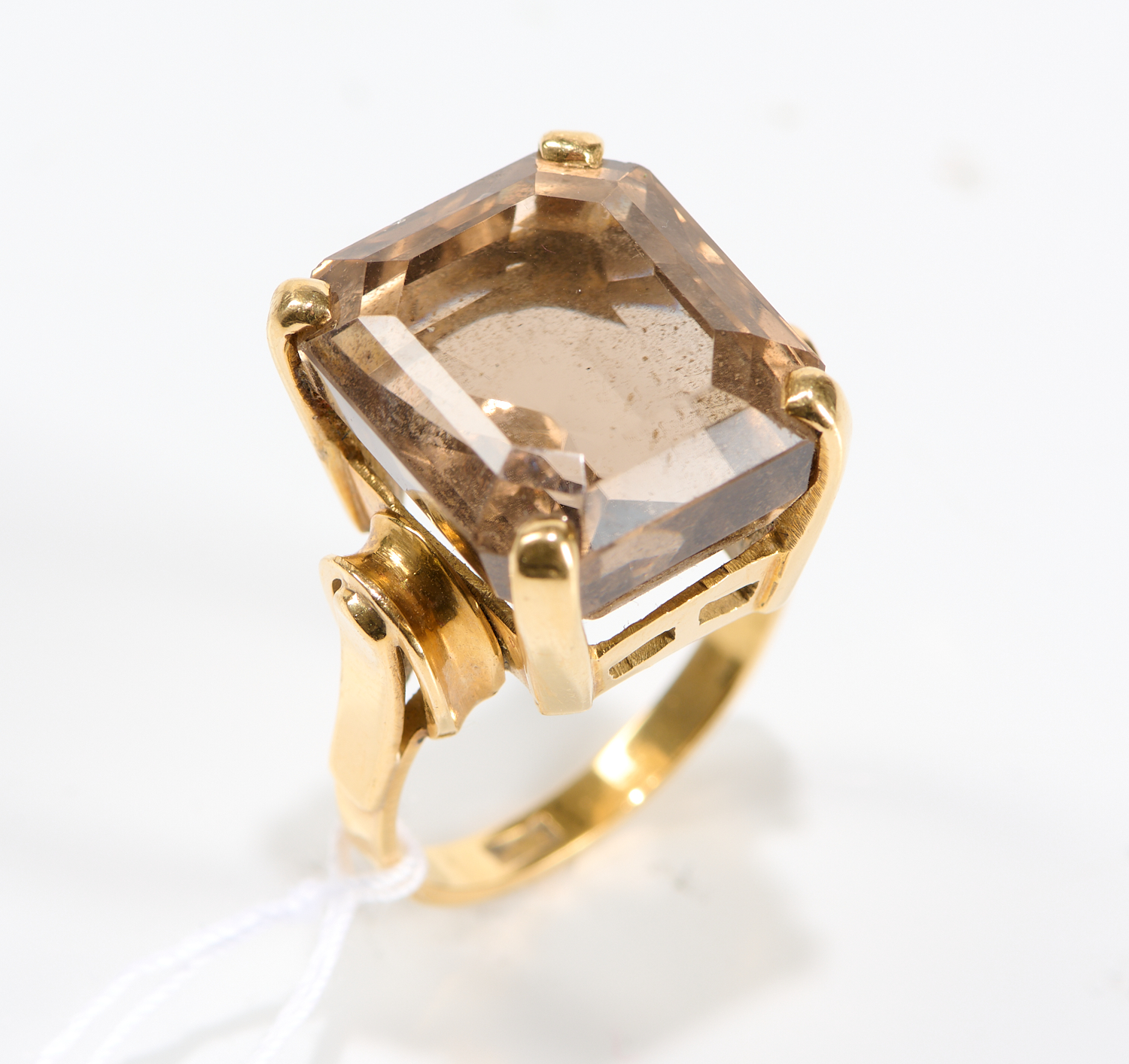 A SMOKEY QUARTZ DRESS RING IN 18CT GOLD, RING SIZE N, 12.4GMS