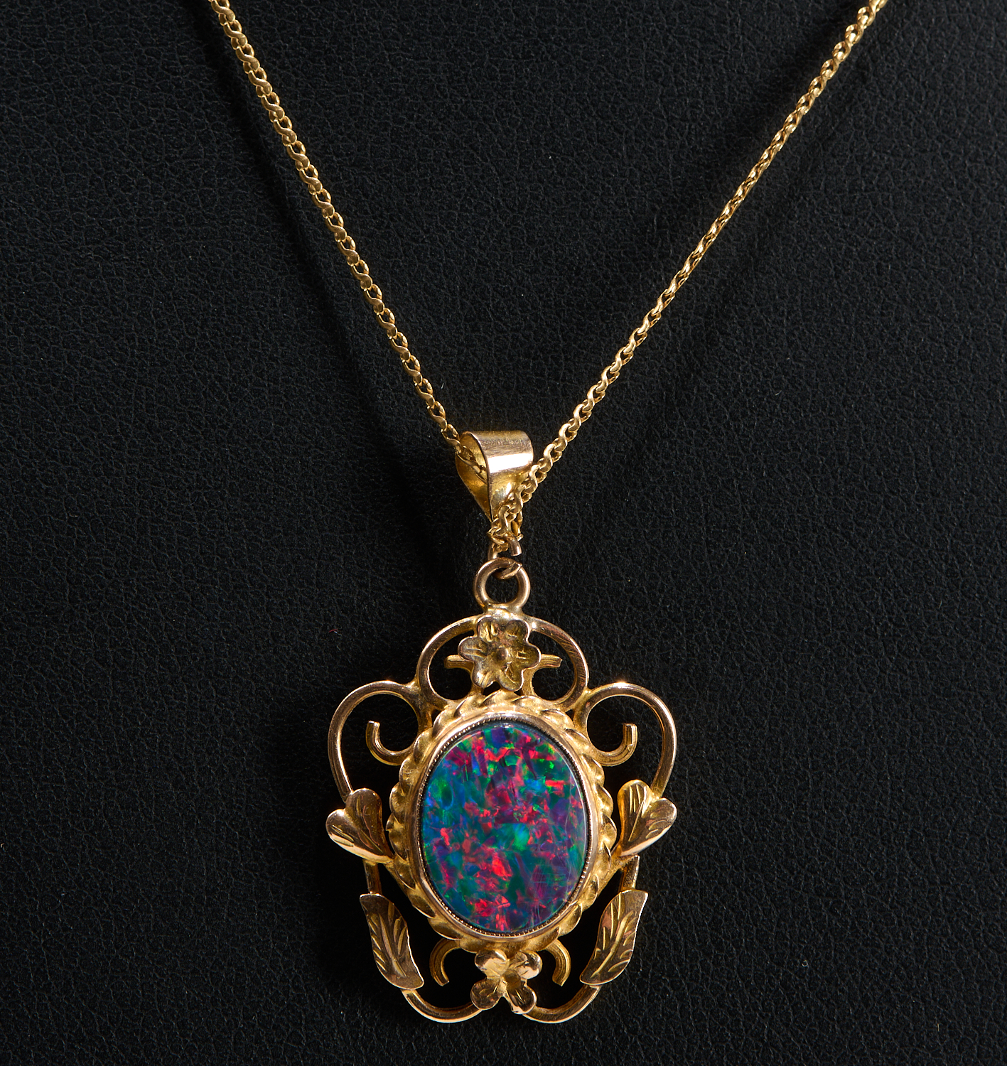 A OPAL DOUBLET SET PENDANT TO 9CT GOLD CASE TO A FANCY LINK CHAIN IN 18CT GOLD, LENGTH APPROXIMATELY 460MM