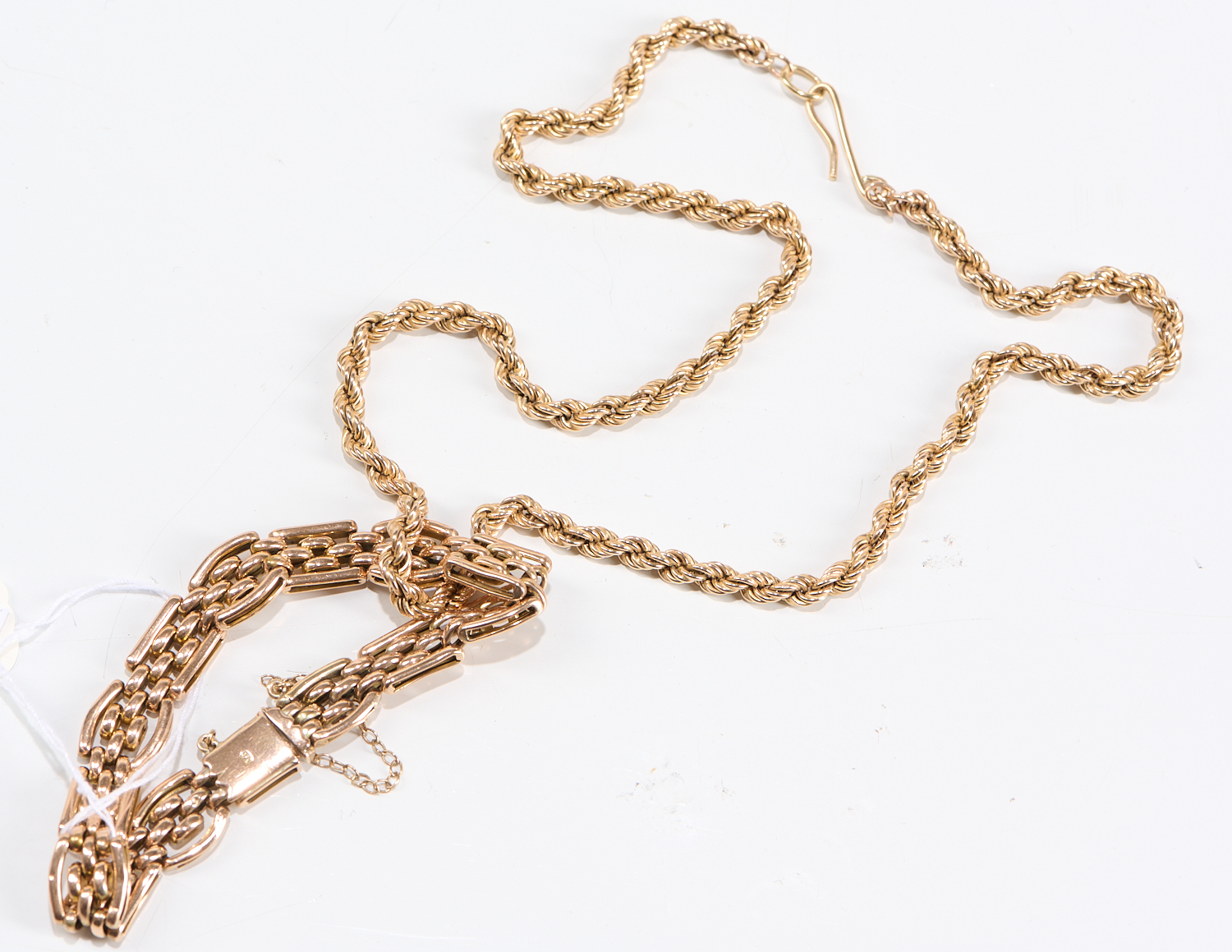 A FANCY LINK BRACELET IN 9CT, LENGTH APPROXIMATELY 180MM AND ROPELINK NECKLACE IN 9CT LENGTH APPROXIMATLEY 440MM, TOTAL WEIGHT 24.57GMS