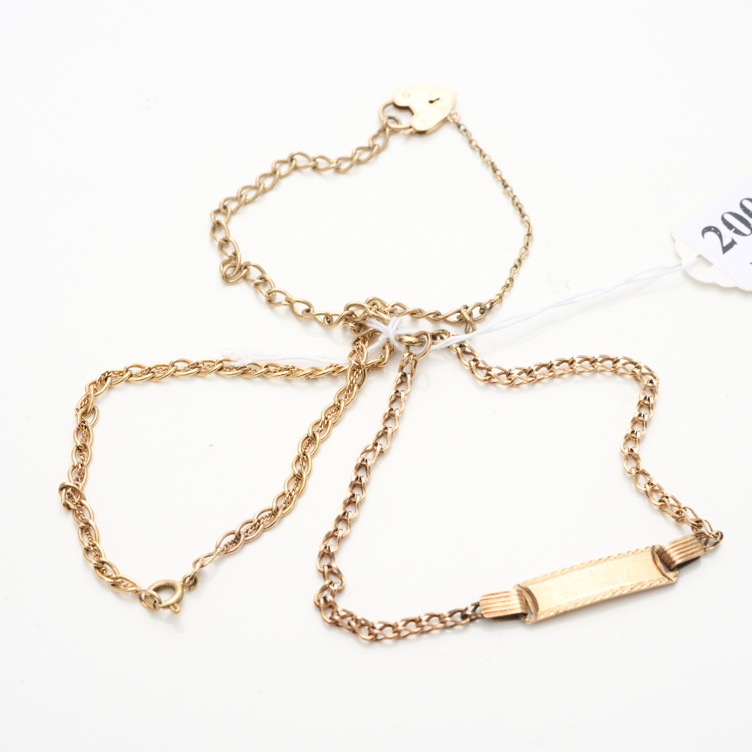 A CHILD'S BRACELET WITH HEART SHAPED PADLOCK CLASP IN 9CT GOLD, 120MM, 3.07GMS, A DOUBLE CHAIN BRACELET IN 9CT GOLD, 170MM, 3.21GMS AND A FANCY LINK BRACLET IN 14CT GOLD (ENGRAVING BAND IN 9CT GOLD) 190MM, 4.27GMS