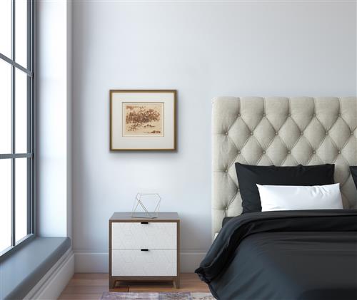 Early signs of foxing are present in the lower center edge of the paper. However, work is in good condition. Frame measuring 52 x 57cm. Please note, this artwork has not been inspected out of the frame.