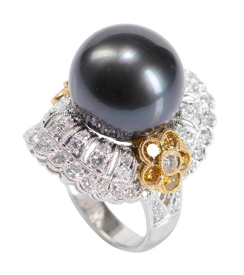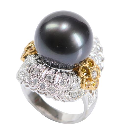The open plaque, centring a round pearl of dark grey hues measuring 14mm, flanked by yellow round brilliant-cut diamond clusters and further brilliant-cut diamonds together weighing approximately 3.00 carats, ring size J.