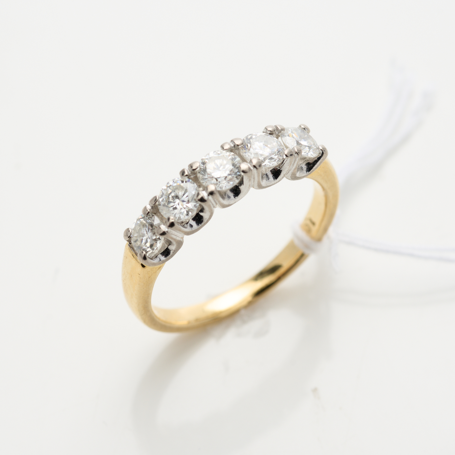 A FIVE STONE DIAMOND RING TOTALLING APPROXIMATELY 1.00CTS, IN 18CT GOLD, RING SIZE O, 4.96GMS