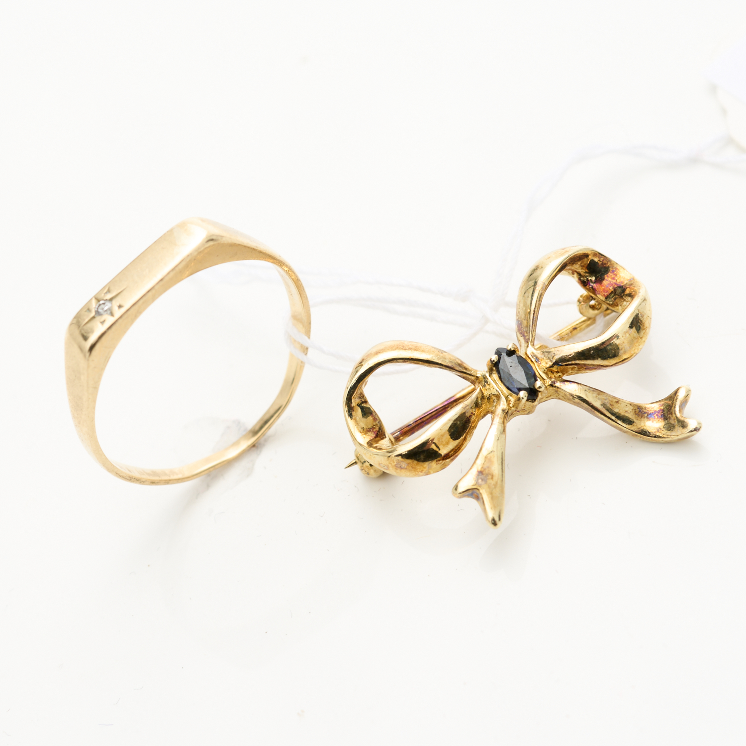 A DIAMOND RING IN 9CT GOLD, TOGETHER WITH A SAPPHIRE SET BROOCH IN GOLD PLATED METAL, RING SIZE Q