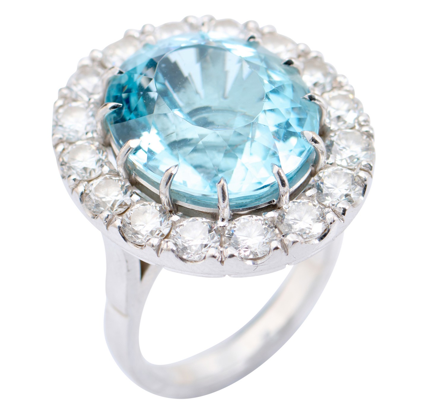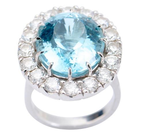 Of cluster design, centring an oval-cut aquamarine weighing approximately 12.37 carats, within a surround of sixteen round brilliant-cut diamonds together weighing approximately 2.40 carats, ring size O.