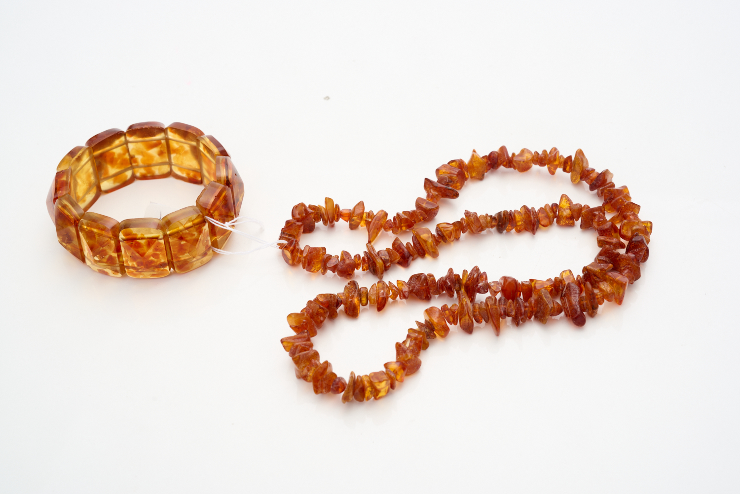 AN AMBER NECKLACE AND BRACELET, THE BRACELET TO AN ELASTIC BAND