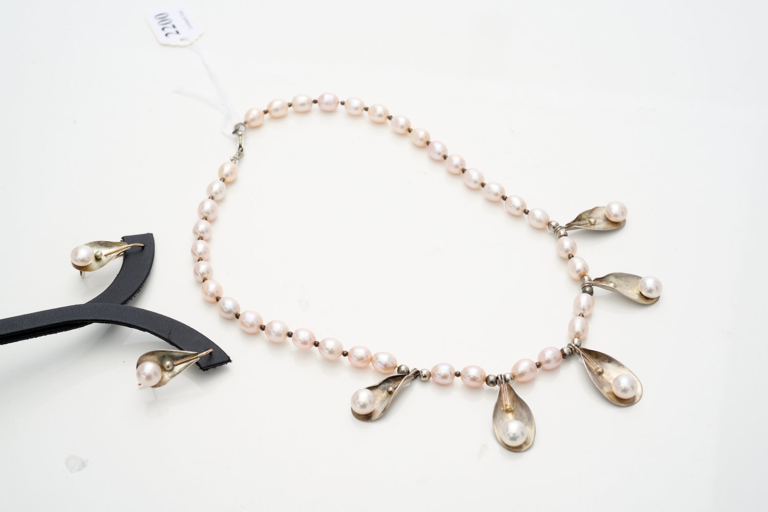 A SILVER AND PEARL NECKLACE WITH MATCHING EARRINGS OF ORGANIC DESIGN, TO SHEPHERDS HOOK FITTINGS