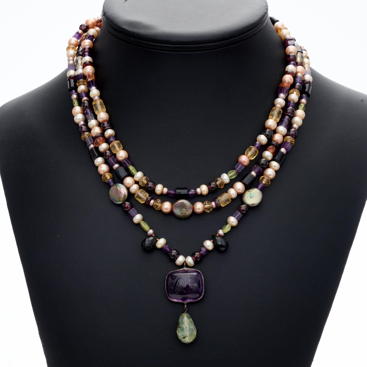 A FRESHWATER PEARL AND AMETHYST, CITRINE AND VARIOUS COLOURED GEM-SET NECKLACE, LENGTH APPROXIMATELY 350MM