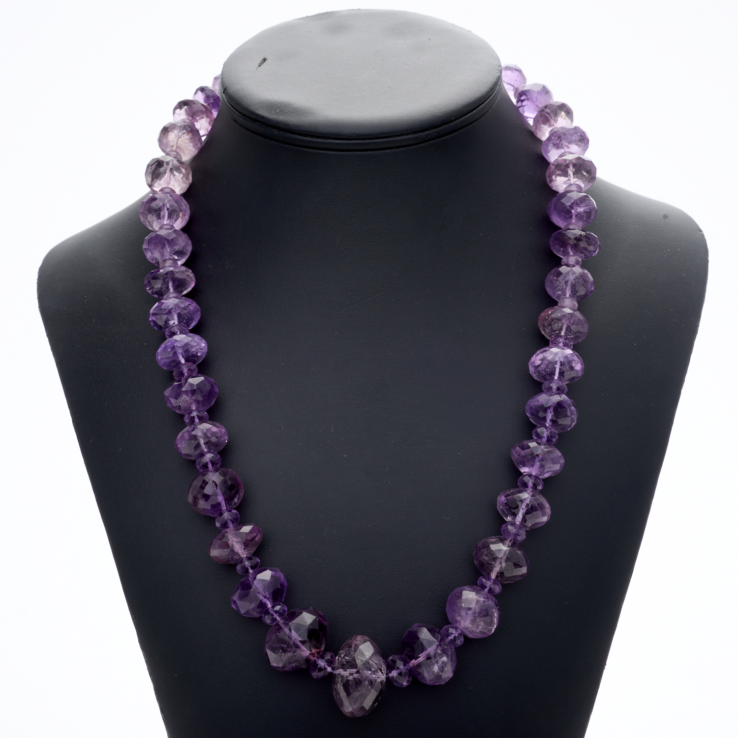 A FACETED AMETHYST BEAD NECKLACE, TO A GOLD PLATED CLASP, LENGTH 590MM