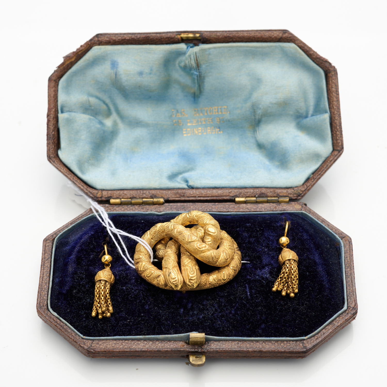 LOVE KNOT BROOCH AND TASSEL EARRINGS IN 15CT GOLD, CIRCA 1870 IN FITTED CASE