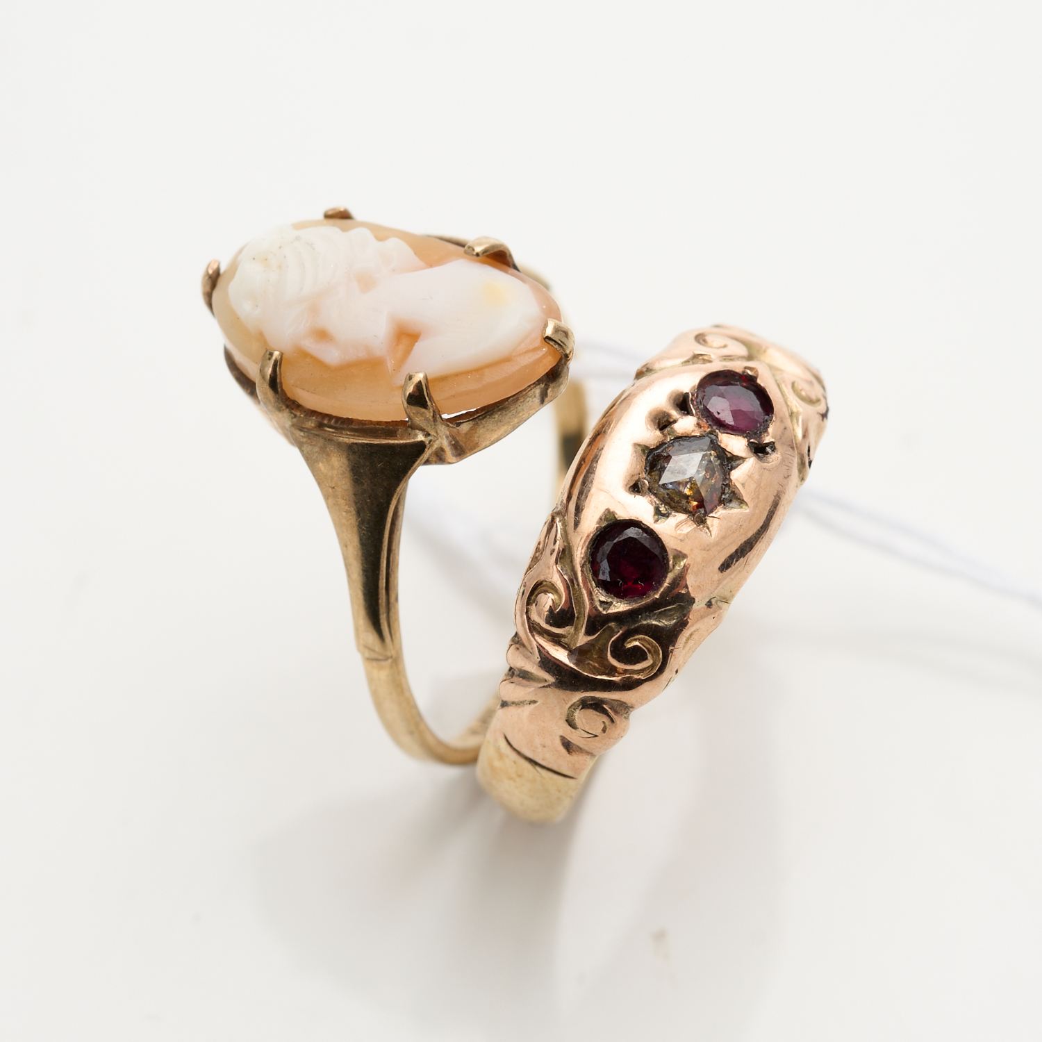 A CAMEO RING, SIZE K-L, AND RED HARDSTONE AND DIAMOND RING, SIZE M-N, BOTH IN 9CT GOLD, TOTAL WEIGHT 3.06GMS