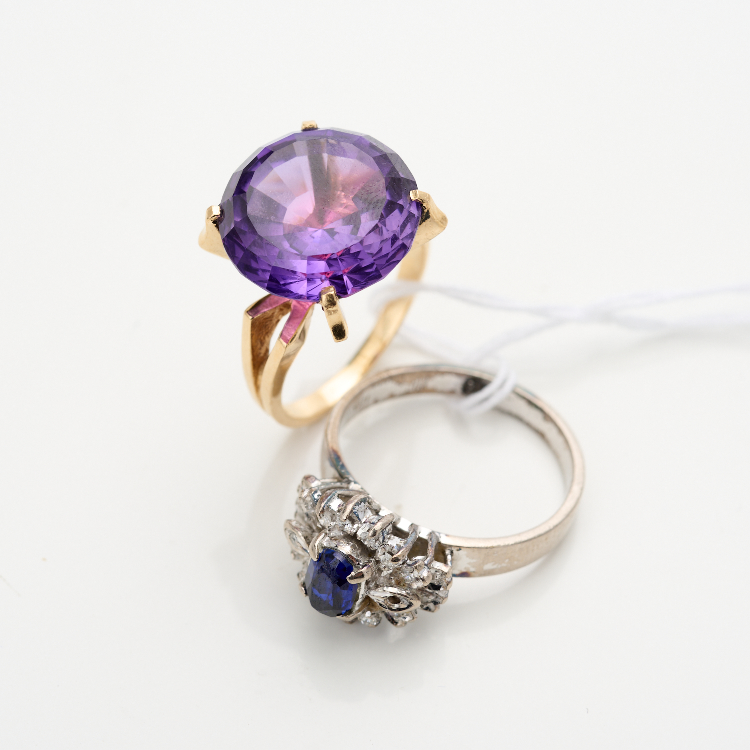 A PURPLE STONE SET RING IN 14CT GOLD, SIZE J-K, 6.40GMS AND A SAPPHIRE AND DIAMOND SET CLUSTER RING IN PLATED WHITE GOLD, SIZE M, 4.08GMS