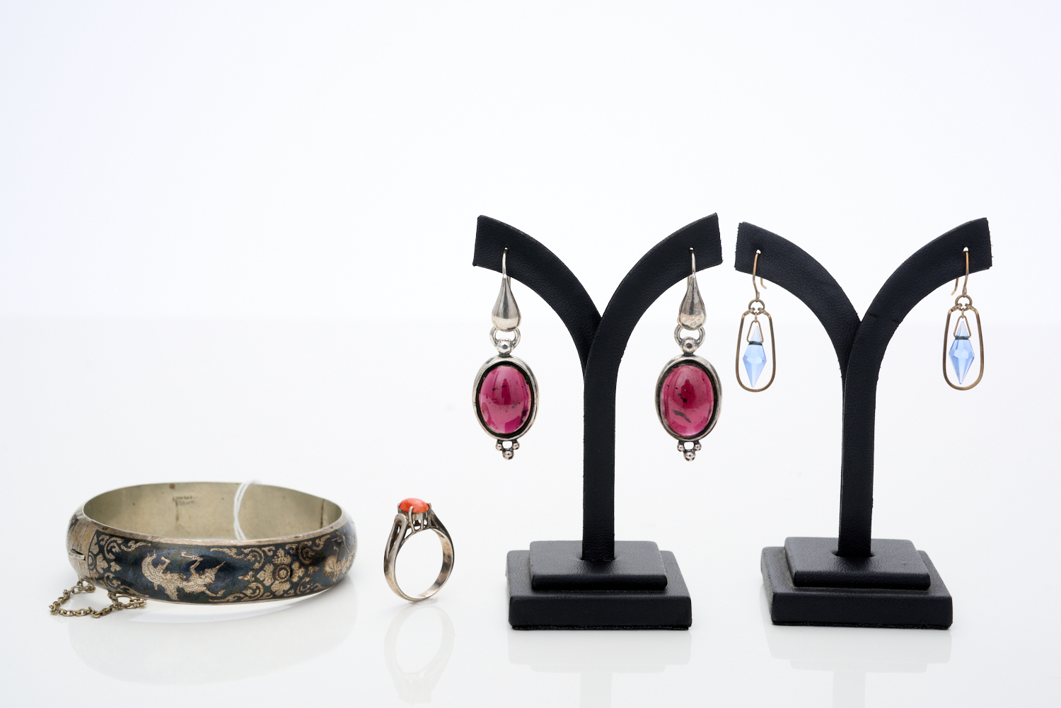 A JEWELLERY SUITE IN STERLING SILVER, COMPRISING TWO PAIRS OF GEM-SET EARRINGS, A CORAL RING AND A VINTAGE THAI SILVER HINGE BANGLE, RING SIZE L