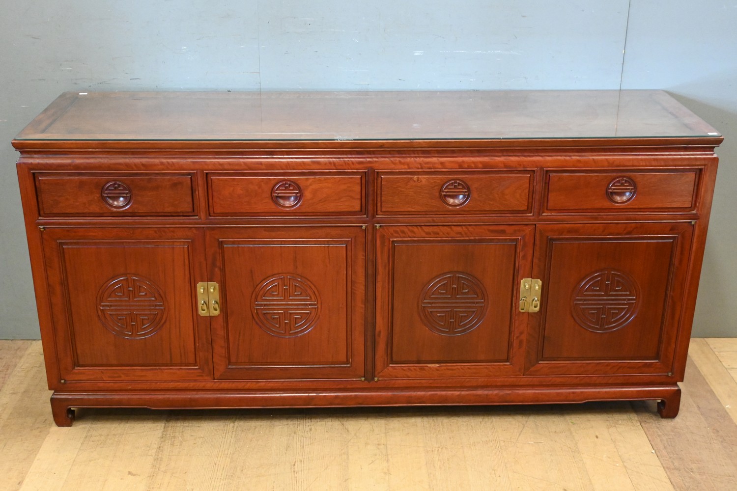 A SUBSTANTIAL CHINESE ROSEWOOD GLASS TOPPED SIDEBOARD ( 87H X 182W X 50D CM) (PLEASE NOTE THIS HEAVY ITEM MUST BE REMOVED BY CARRIERS AT THE CUSTOMER'S EXPENSE. LEONARD JOEL STAFF CANNOT ASSIST CARRYING THIS ITEM) (X-LARGE ITEM)